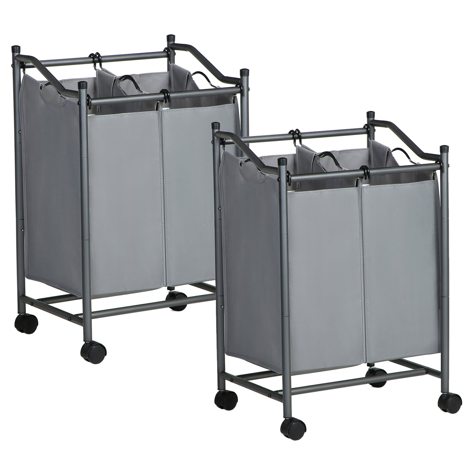 Wasmand 3 compartimenten, set van 2, wasverzamelaar op wielen, wassorteerder, wassorteersysteem, waswagen met handvatten, waszak, uitneembare stoffen zakken, grijs LSF003GS02